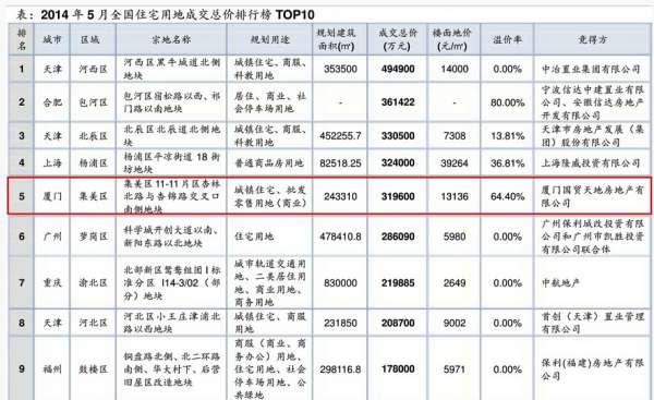 收藏 5月集美地王楼面价全国第三 成交总价居第五