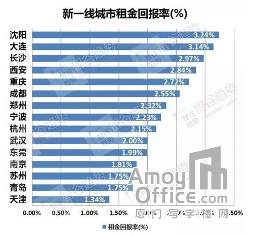 沈阳、大连这两个东北省会排名最前,因为它们整体房价较低,这也侧面体现出东北市场相对冷清的状况。南京、苏州等这一轮房价上涨凶猛的城市,租金回报率都较低。