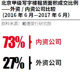 内资企业在北京写字楼市场表现活跃,在过去一年里,吸纳了整个市场73%的面积。我们预期这一趋势将延续至明年。就产业类型而言,自去年6月份以来金融产业占据了北京写字楼市场的最大份额,达到了34%。同时,北京是重要的科技中心,推动TMT企业需求稳步增长,仅次于金融企业,占甲级写字楼总成交面积的25%。