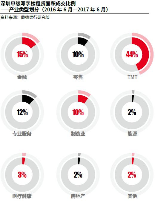 过去12个月中,内资企业在深圳写字楼市场的需求保持旺盛态势。一些知名企业,例如恒大集团,纷纷在深圳设立新总部。市场中近80%的交易(按面积)是来自于内资企业。考虑到深圳是众多国际知名科技企业的总部聚集地,高科技产业已成为其发展的支柱产业,那么TMT行业占总租赁成交面积的44%就不令人感到意外了。