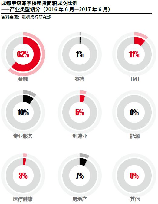 在过去1年里,成都的办公需求也呈现了同比增长的态势。2016年6月至2017年6月期间,内资企业吸纳量占据总吸纳面积的60%。金融业主导了成都的写字楼租赁市场,占比达62%。这与成都是中国西部地区的金融中心,已吸引众多海内外金融机构不无关系。